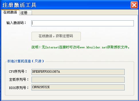 | 1、点击Knowledge Builder 的“帮助->注册”菜单,在弹出的“注册激活工具”对话框中获取本地计算机信息。 |