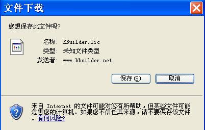 | 2、在本网页中填写激活码和计算机信息,然后点击“提交并获取授权文件”,在弹出的对话框中选择“保存”为*.lic文件(默认为KBuilder.lic)。 |