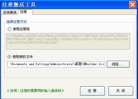 3、在“注册激活工具”对话框中选择“注册”标签,然后选择“使用授权文件”,点击“浏览”按钮选择以上保存的“*.lic”文件。 最后点击“注册”按钮完成软件注册。 (注:此授权文件与计算机信息进行了绑定,更换计算机将无法使用。) |